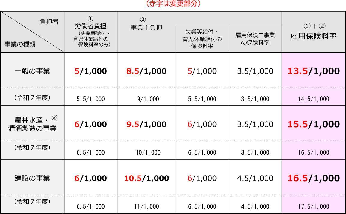 ・失業等給付等の保険率は、労働者負担・事業主負担ともに6/1,000に変更になります(農林水産・清酒製造の事業及び建設の事業は7/1,000に変更になります。)。