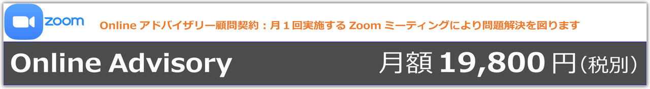 メールアドバイザリーの内容(月間5通までのメールによるご質問・ご相談への対応)に加え、月1回、目安として1時間程度のZoomを用いたオンライン・ミーティングによるコンサルティングをパッケージしたサービスです。